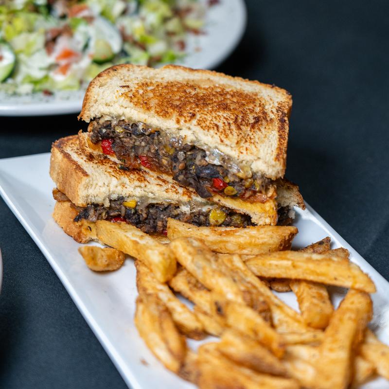 Smoky black bean and poblano patty with roasted red peppers, caramelized onions, Pepper Jack cheese, and avocado ranch on grilled sourdough. A veggie burger with attitude, flavor, and a little kick.