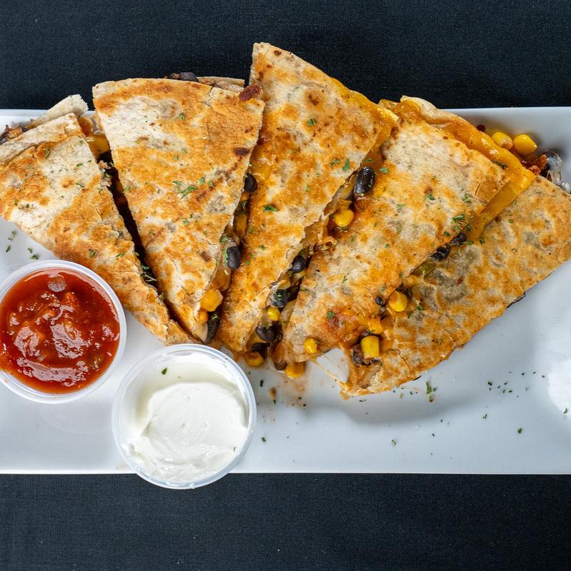 Grilled herb tortilla stuffed with melted Monterey Jack, our house-made black bean & corn salsa, and a kick of jalapeño, served with salsa & sour cream on the side.