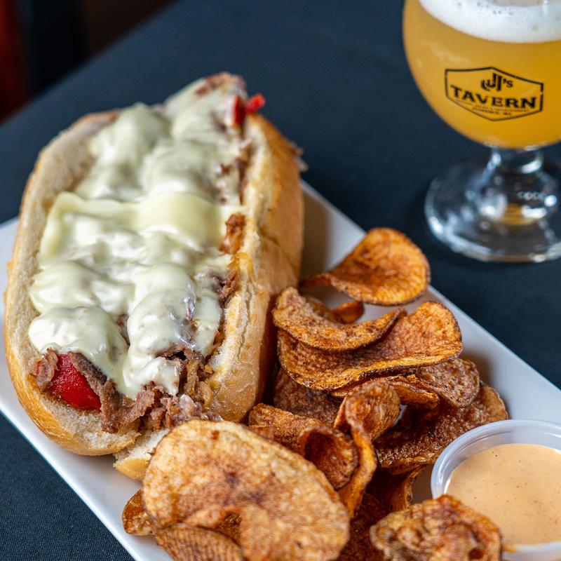 Thinly shaved sirloin piled high with melted American cheese, sweet caramelized onions, and fire-roasted red peppers tucked into a grilled sub roll.