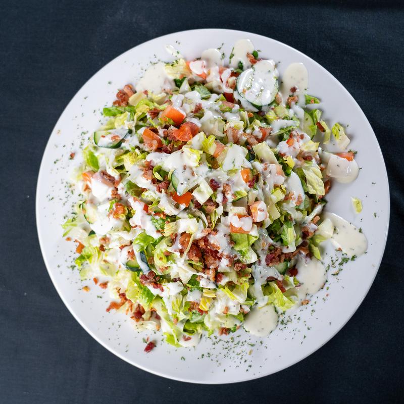 Shaved romaine with diced tomato, cucumber, and candied bacon tossed in a creamy ranch | Add Chicken +$20.00